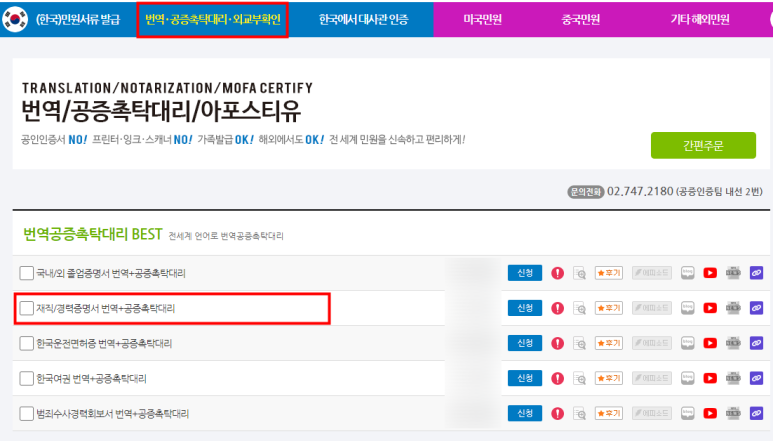 - 상단의 [번역/공증촉탁대리/외교부확인] 란을 클릭한다