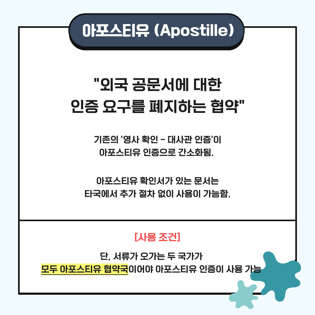 아포스티유는 "외국 공문서에 대한 인증 요구를 폐지하는 협약"입니다.