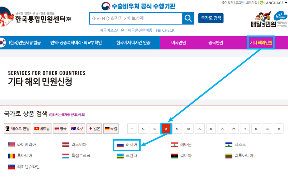 2. 우측 상단 '기타 해외민원' - 초성 'ㄹ' 클릭(러시아)
