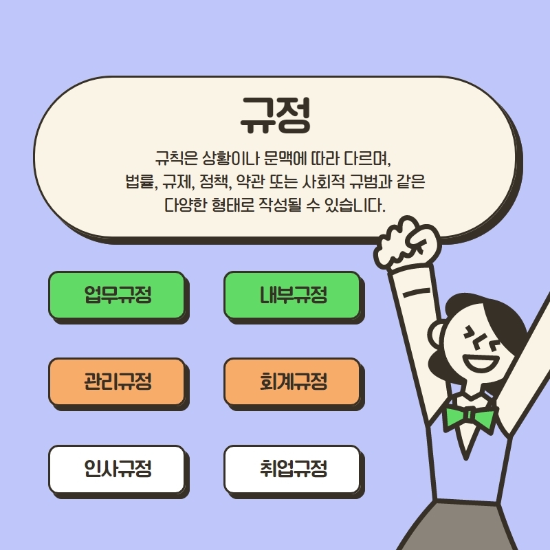 규정은 조직 구성원이 지켜야 할 약속과 기준, 규범 등을