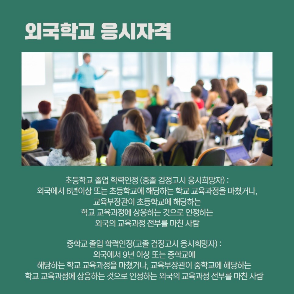 중학교 졸업 학력 인정(고졸 검정고시 응시희망자) : 외국에서 9년 이상 또는 중학교에