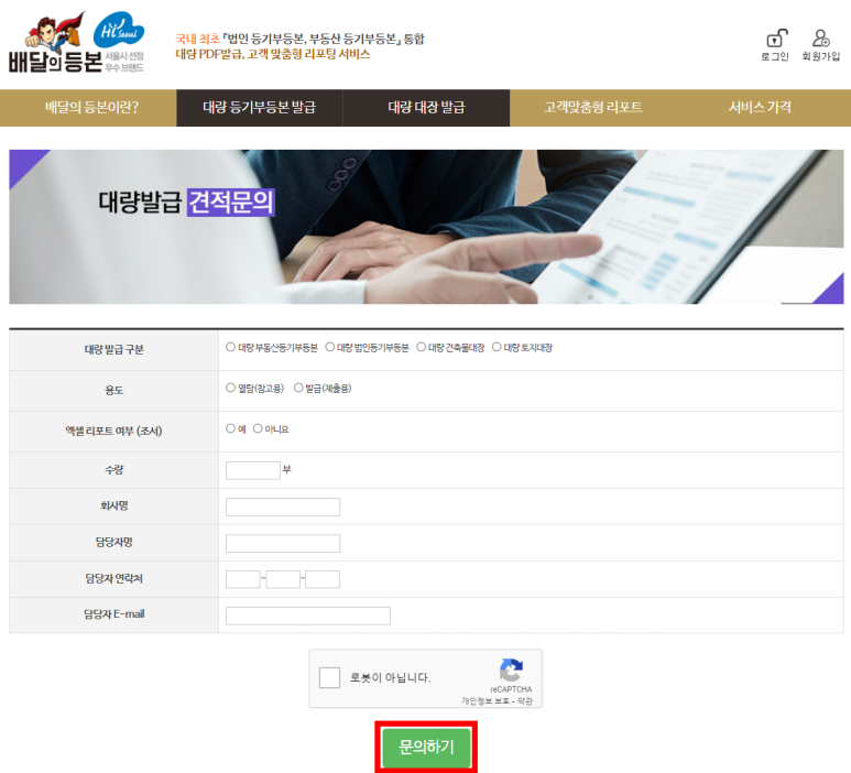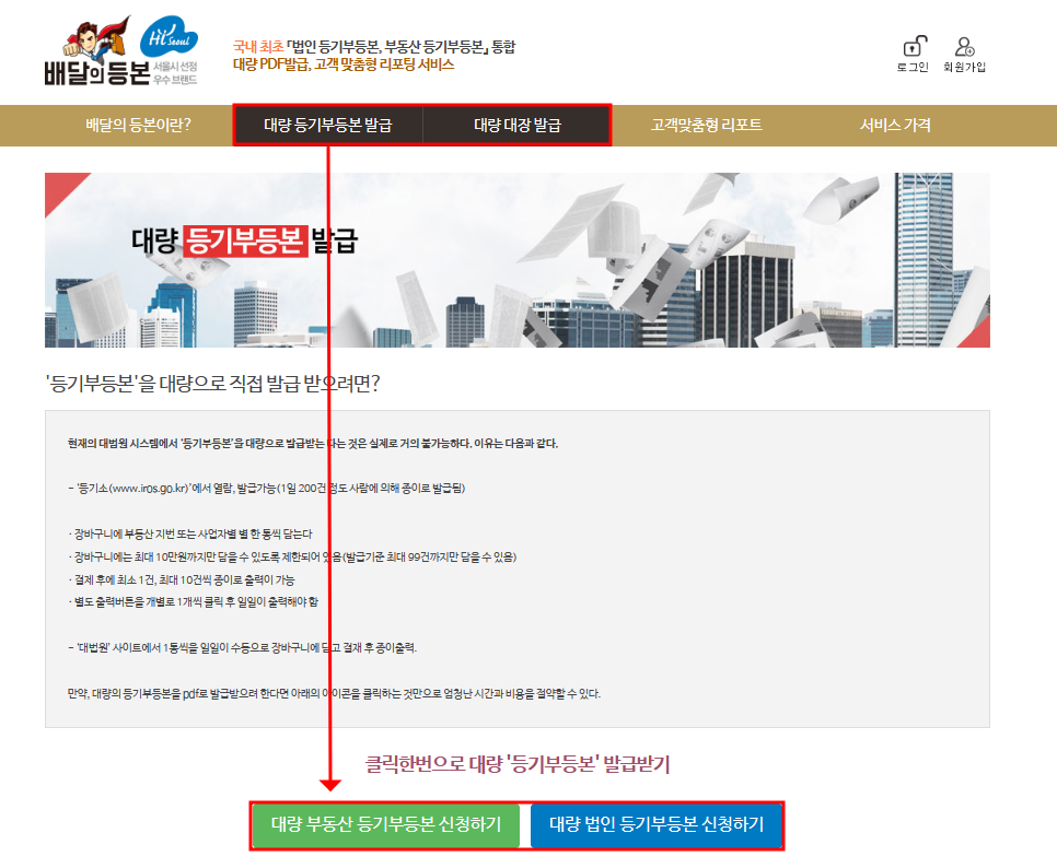 "대량 등기부등본/대장 발급" ➡ 신청하기 를 눌러주세요.