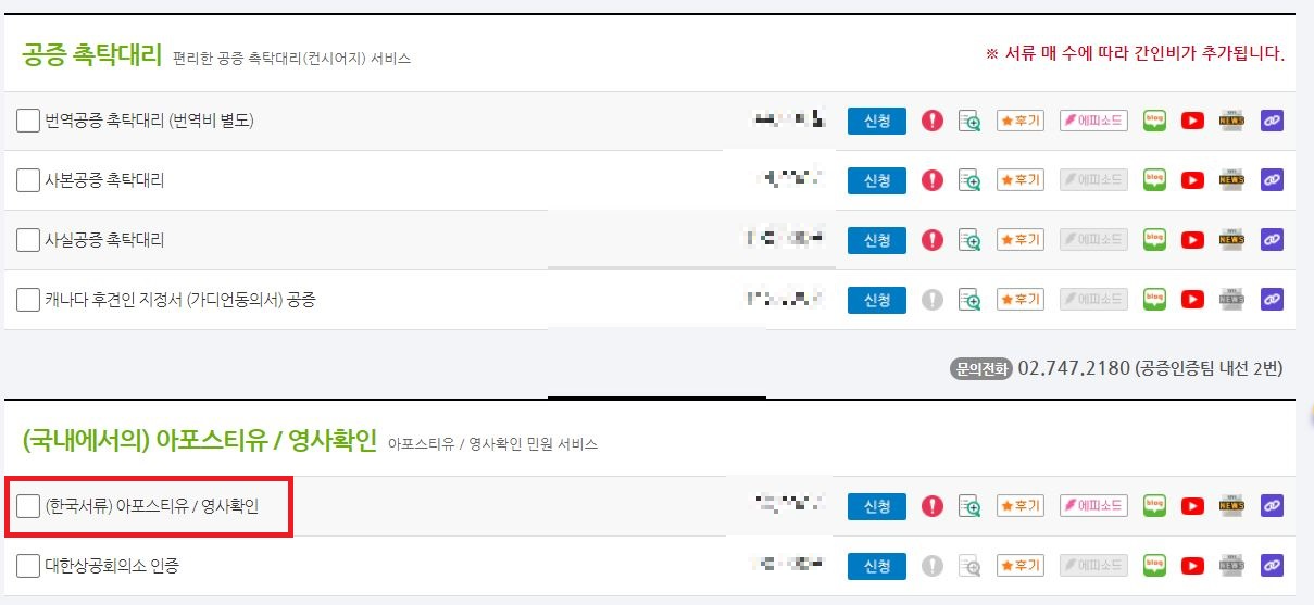 맨 하단의 '(한국서류) 아포스티유 / 영사확인'을 선택해 주세요!