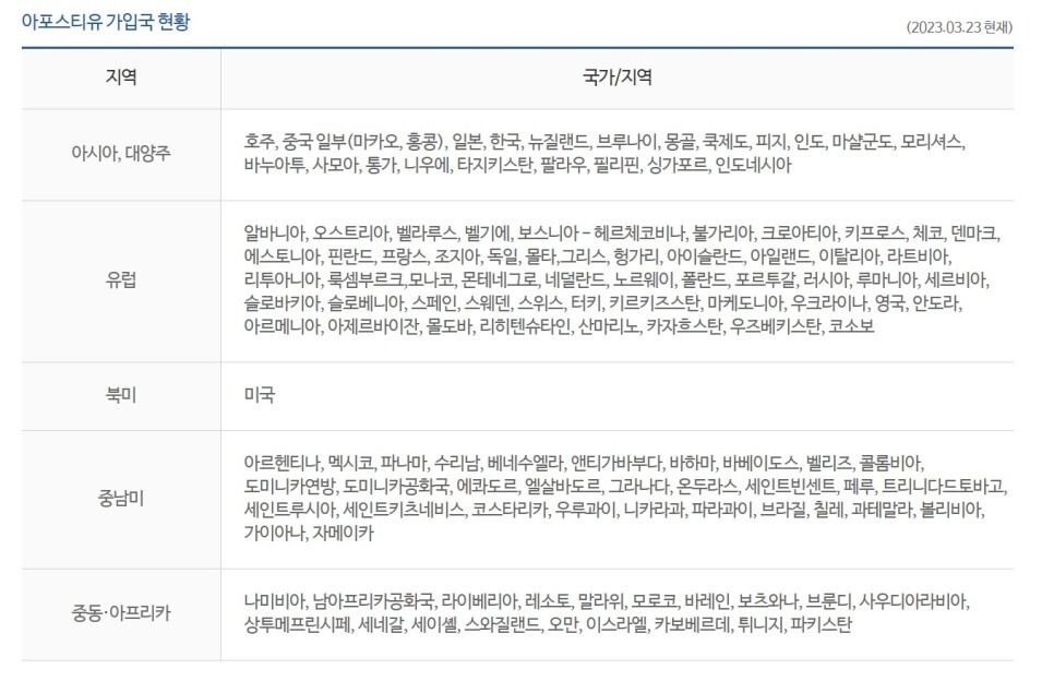 아포스티유 협약국은 아래의 사진과 같으니 참고해주시길 바랍니다.