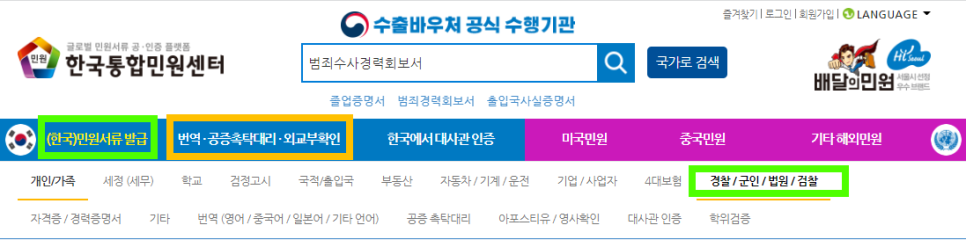 상단메뉴에서 [민원서류 발급] > 경찰/군인/법원/검찰 선택