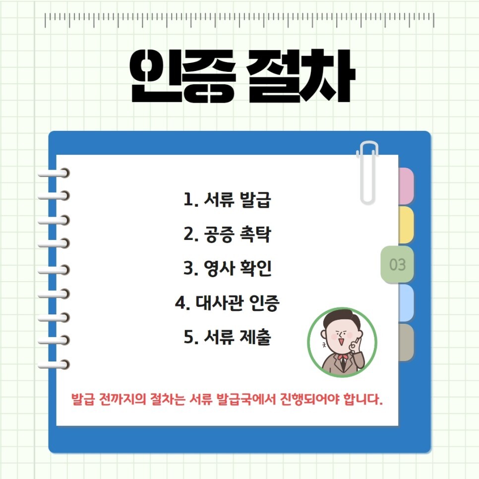 서류 발급 → 공증 촉탁 → 영사 확인 → 대사관 인증 → 서류 제출 이며,