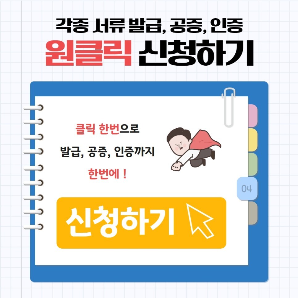 개인 서류 | 기본증명서, 가족관계증명서, 혼인관계증명서, 입양관계증명서, 이혼판결문, 성적증명서, 생활기록부, 졸업증명서, 범죄경력증명서, 여권, 은행잔고증명서, 재정증명서, 출생증명서, 학위 증명서, 개인위임장 |