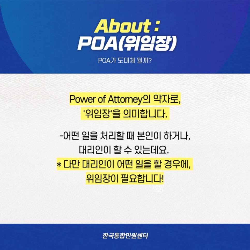 Power of Attorney의 약자로, '위임장'을 의미합니다.