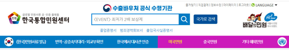 2. 상단의 ' 미국 민원 ' ( 타국이시라면 ' 기타 해외민원 ' → 원하는 국가 ) 을 클릭한다.