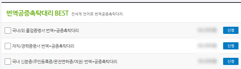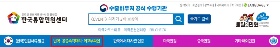 2. 상단의 ' 번역 · 공증촉탁대리 · 외교부확인 ' 을 클릭 후 국가, 서비스를 선택한다.
