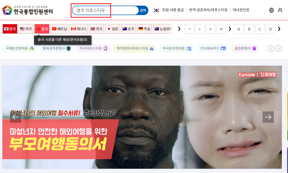 A. 한국통합민원센터에서 '영국 아포스티유'를 검색!