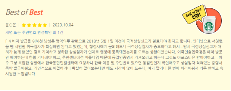 F-4 비자 발급을 위해선 남성은 병역의무 관련으로 2018년 5월 1일 이전에 국적상실신고가 완료돼야 한다고 합니다. 인터넷으로 서칭했을 땐 시민권 취득일자가 확실하면 된다고 했었는데, 행정사에게 문의해보니 국적상실일자가 중요하다고 해서...당시 국정상실신고가 처리가 늦게 됐었던 걸로 기억하고 정확한 상실일자가 언제로 행정에 등록돼있는지를 모르는 상황이었습니다. 외국인출입국청은 예약 방문만 해야하는데 한참 기다려야 하고, 주민센터에선 미들네임 때문에 동일인증명서 가져오라고 하는데 그것도 아포스티유 받아야하고... 아주 그냥 복잡한 상황에서 한국통합민원센터에 요청하니 한국 이름 및 주민번호 있으면 동일인인지 확인해주고 상실일자 적혀있는 증명서 뚝딱 발급해줬요. 개인적으로 해결하려니 확실히 알아보는데만 해도 시간이 많이 드는데, 여기 맡기니 한 번에 처리해줘서 너무 편하고 속 시원한 느낌입니다. |