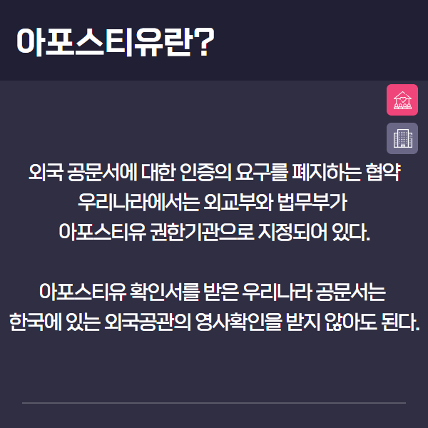 '아포스티유' 는 번역된 서류가 번역되기 이전의 서류와 동일하다는 걸 인증받는 과정인데,