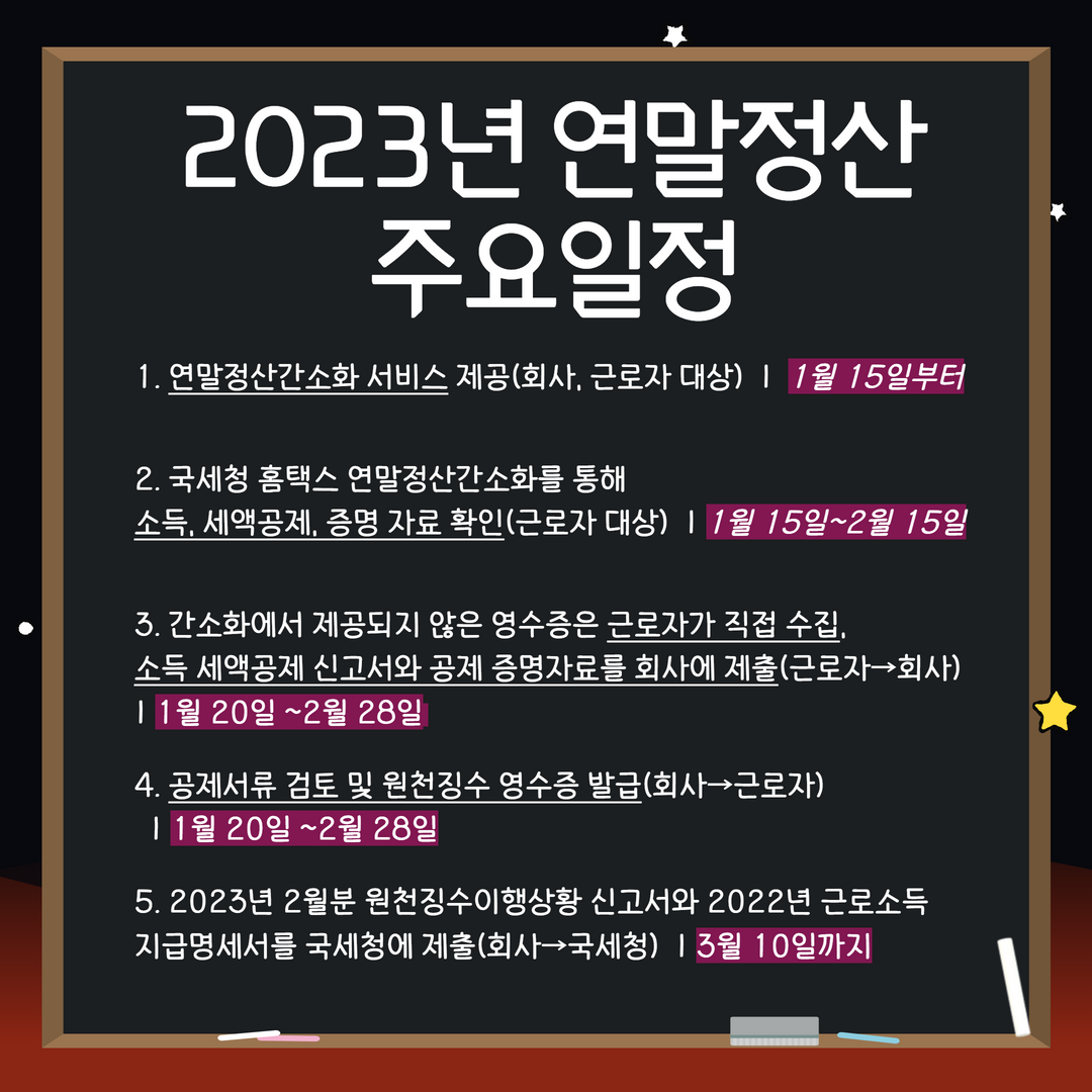 2023년 연말정산 주요 일정은 다음과 같습니다.