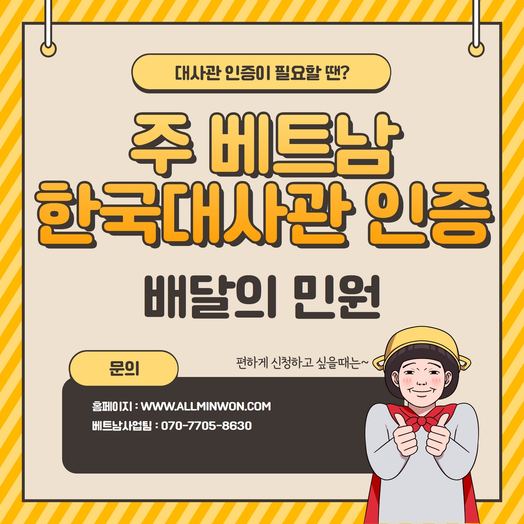 배달의 민원을 통해 원하는 곳 어디서든 주 베트남 한국 대사관인증을 받아보세요!