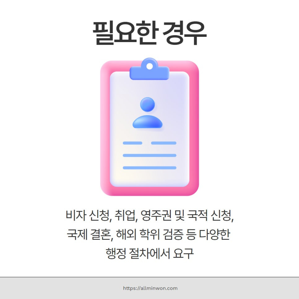 국제 결혼, 해외 학위 검증 등 다양한 행정 절차에서 요구됩니다.