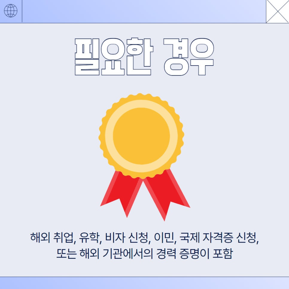 국제 자격증 신청, 또는 해외 기관에서의 경력 증명이 포함됩니다.