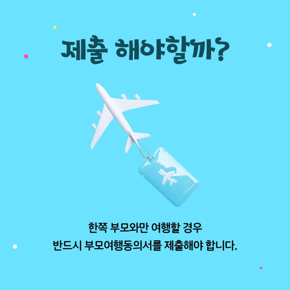 한쪽 부모와만 여행할 경우 반드시 부모여행동의서를 제출해야 합니다.