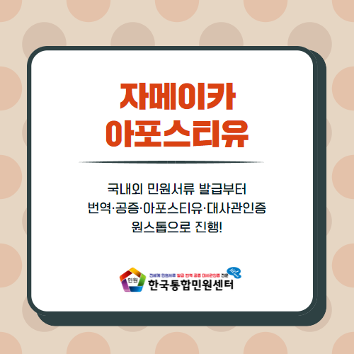 자메이카에서 사용할 출생증명서, 재직증명서, 위임장 등 한국통합민원센터와 함께라면 발급부터 번역, 공증, 아포스티유까지 한 번에 해결하실 수 있어요!