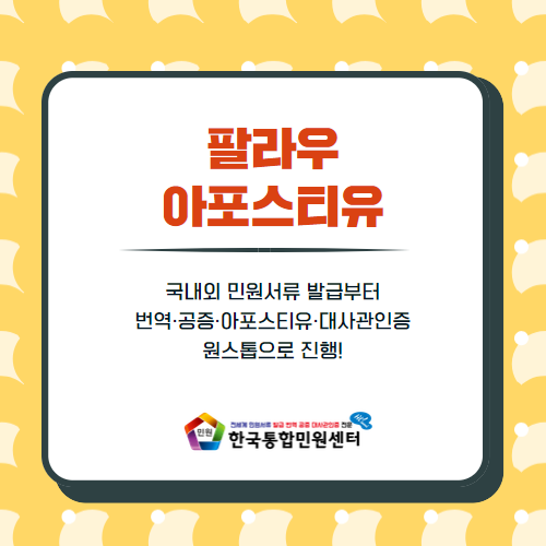 팔라우에서 사용할 졸업증명서, 가족관계증명서, 위임장, 출생증명서, 사업자등록증 등 한국통합민원센터와 함께라면 서류 준비가 훨씬 쉬워집니다!