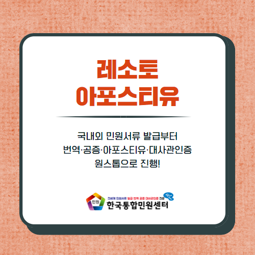 레소토에서 사용할 졸업증명서, 건강진단서, 위임장, 계약서, 성적증명서 등 한국통합민원센터와 함께라면 어렵고 복잡한 인증 절차도 빠르게 해결하실 수 있어요!