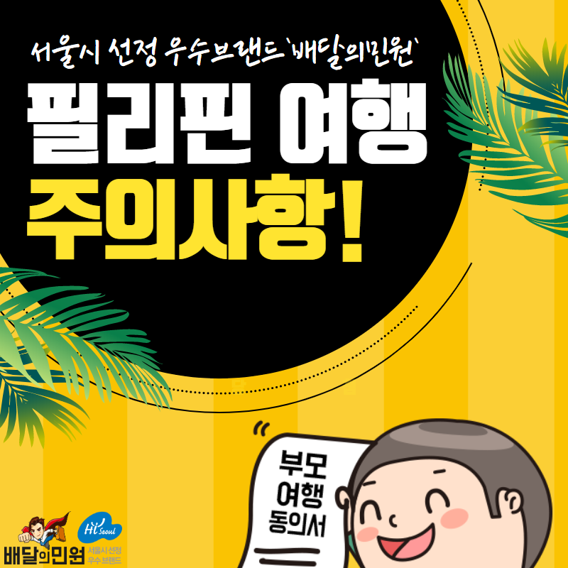 서울시 선정 우수브랜드 '배달의민원'에서 진행하는 부모여행동의서 겨울방학 최저가 할인 이벤트 입니다. 많은 참여 부탁드립니다!! 상담전화 : 02-747-2184 #필리핀부모여행동의서 #베트남부모여행동의서 #미국부모여행동의서 #괌부모여행동의서 #사이판부모여행동의서 #하와이부모여행동의서